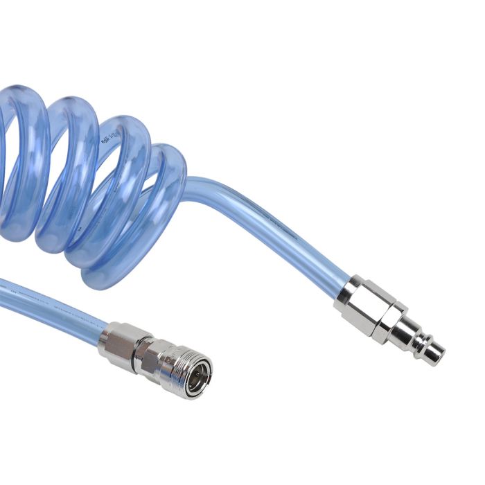 NITRA pneumatic coiled hose, polyurethane, clear blue, 3/8in inside diameter, 0.5625in outside diameter, 3/8in chrome plated steel quick-disconnect fittings, 8ft working length.