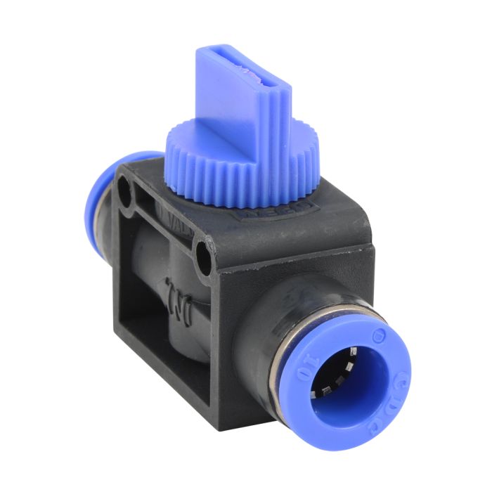 NITRA pneumatic push-to-connect fitting, union straight manual hand valve, 3-way, thermoplastic (PBT) body, (2) 10mm tube connection(s). Package of 2.