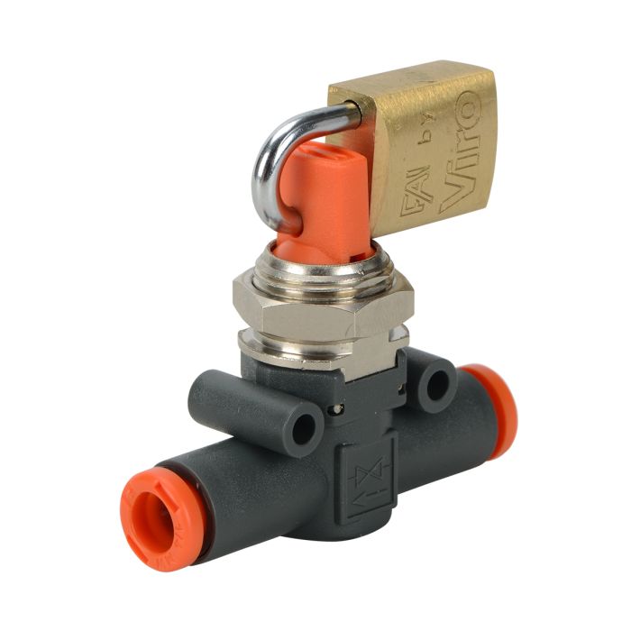 NITRA pneumatic push-to-connect fitting, inline manual shutoff valve, locking, 2-way, technopolymer body, (2) 1/4in tube connection(s).