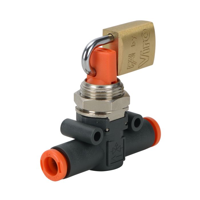 NITRA pneumatic push-to-connect fitting, inline manual shutoff valve, locking, 3-way, technopolymer body, (2) 1/4in tube connection(s).