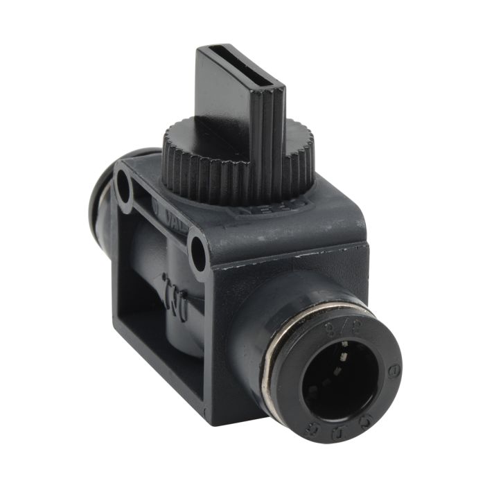 NITRA pneumatic push-to-connect fitting, union straight manual hand valve, 3-way, thermoplastic (PBT) body, (2) 3/8in tube connection(s). Package of 2.
