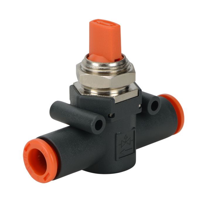 NITRA pneumatic push-to-connect fitting, inline manual shutoff valve, 3-way, technopolymer body, (2) 5/16in (8mm) tube connection(s).