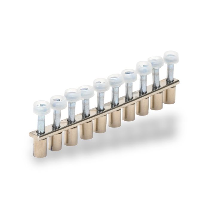 Konnect-It terminal block jumper, 10-pole, screw-down type. Works with multiple terminal blocks. 5 pieces per package.