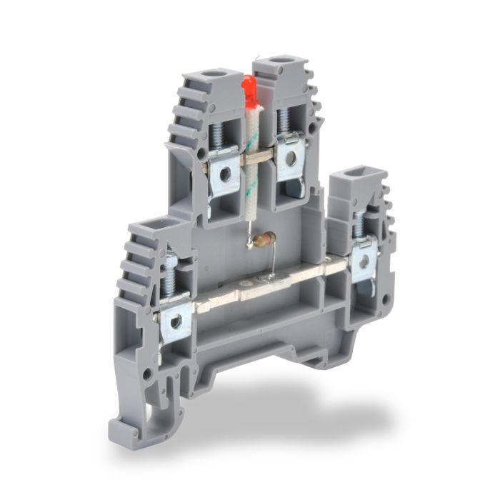 Konnect-It double-level terminal block, with 110VDC LED connected between levels, 26-10 AWG, gray, 30A, 300V rated (UL). 20 pieces per package.