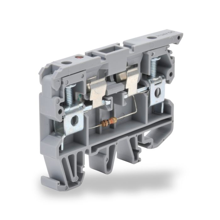 Konnect-It fuse terminal block, with 24VDC LED, 26-8 AWG, gray, 6.3A, 300V rated (UL). Accepts 5mm x 20mm fuses. 25 pieces per package.
