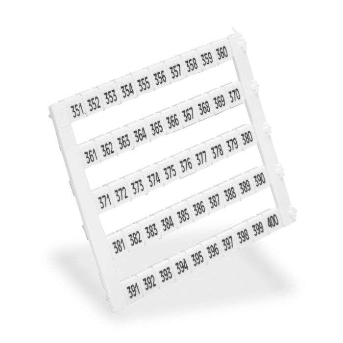 Konnect-It marking tag, 5 x 5 mm, numbered 351-400 (5 of each number). Use with any Konnect-It series terminal block. 250 pieces per package.