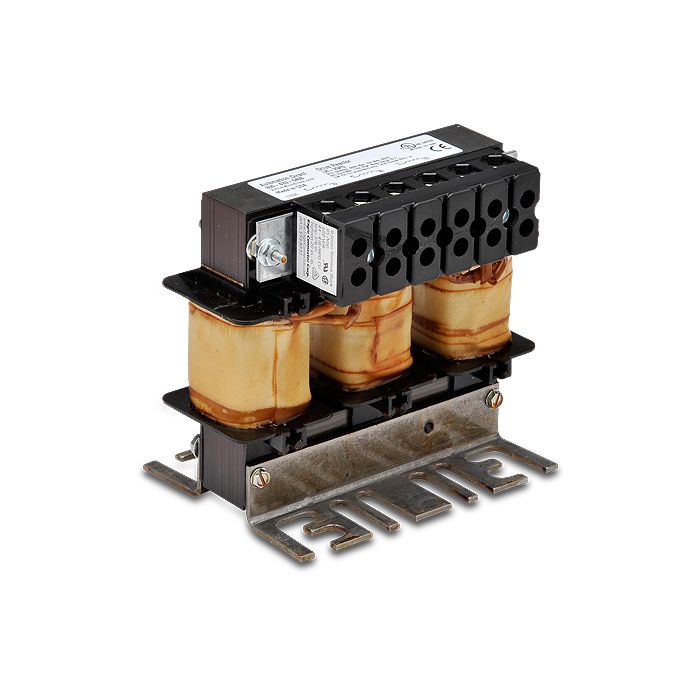 LR series line reactor, 230 VAC, 5hp, 3-phase, 16.7A, 3% impedance, input or output side. For use with multiple AC drives.