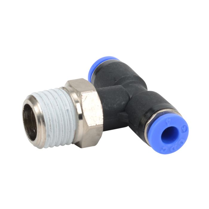 NITRA pneumatic push-to-connect fitting, male, branch tee, rotating, thermoplastic (PBT) body, nickel-plated brass threads, (2) 5/32in (4mm) tube to R1/4 BSPT connection(s). Package of 5.