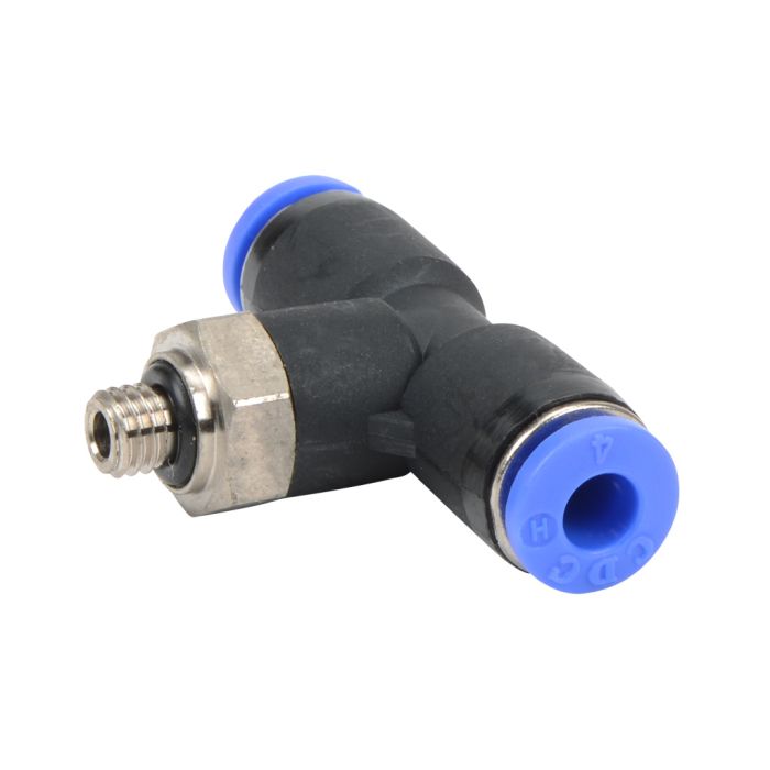 NITRA pneumatic push-to-connect fitting, male, branch tee, rotating, thermoplastic (PBT) body, nickel-plated brass threads, (2) 5/32in (4mm) tube to M5 X 0.8 threaded connection(s). Package of 5.