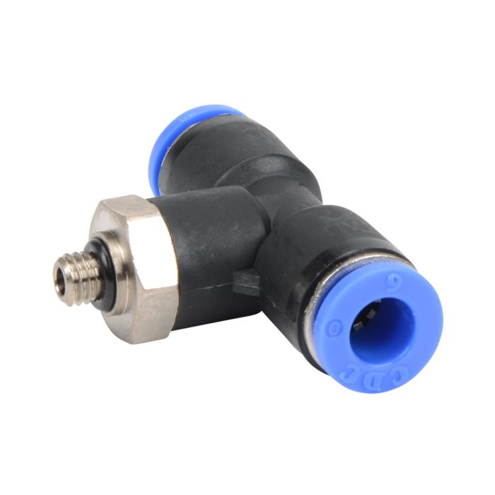 NITRA pneumatic push-to-connect fitting, male, branch tee, rotating, thermoplastic (PBT) body, nickel-plated brass threads, (2) 6mm tube to M5 X 0.8 threaded connection(s). Package of 5.