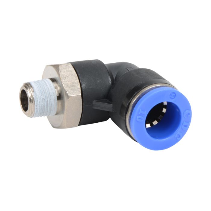 NITRA pneumatic push-to-connect fitting, male, elbow, rotating, thermoplastic (PBT) body, nickel-plated brass threads, 10mm tube to R1/8 BSPT connection(s). Package of 5.