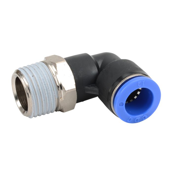 NITRA pneumatic push-to-connect fitting, male, elbow, rotating, thermoplastic (PBT) body, nickel-plated brass threads, 12mm tube to R1/2 BSPT connection(s). Package of 5.