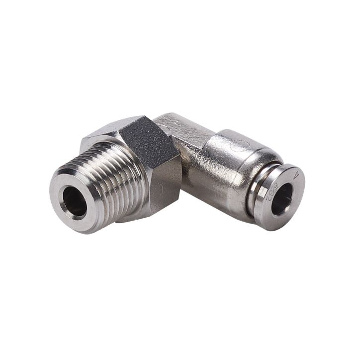 NITRA pneumatic push-to-connect fitting, male, elbow, rotating, 316 stainless steel body, 316 stainless steel threads, 5/32in (4mm) tube to R1/8 BSPT connection(s).