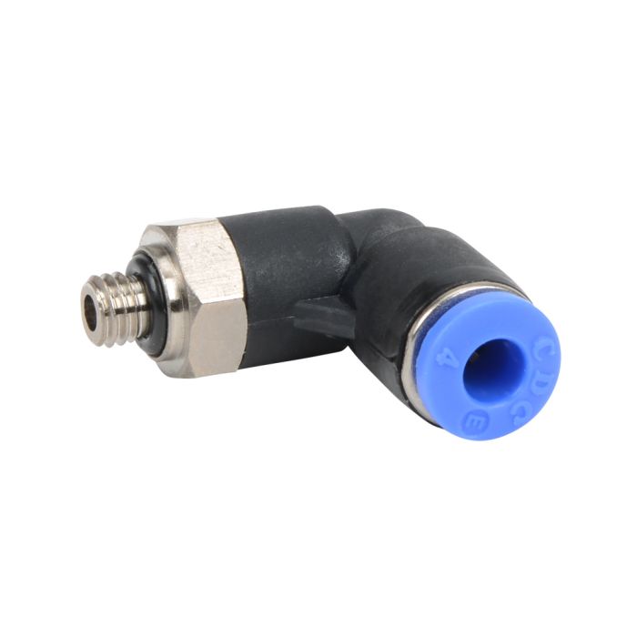 NITRA pneumatic push-to-connect fitting, male, elbow, rotating, thermoplastic (PBT) body, nickel-plated brass threads, 5/32in (4mm) tube to M5 X 0.8 threaded connection(s). Package of 5.