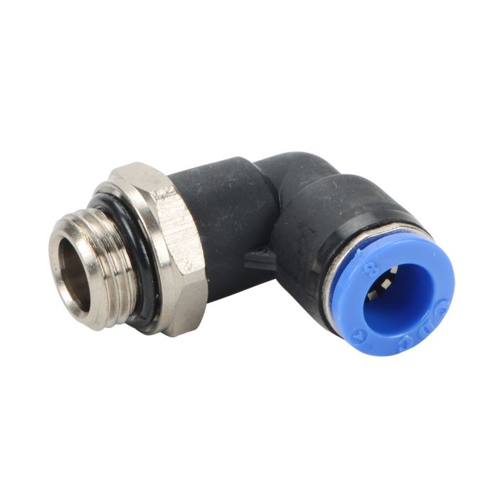 NITRA pneumatic push-to-connect fitting, male, elbow, rotating, thermoplastic (PBT) body, nickel-plated brass threads, 5/16in (8mm) tube to G1/4 BSPP connection(s). Package of 5.