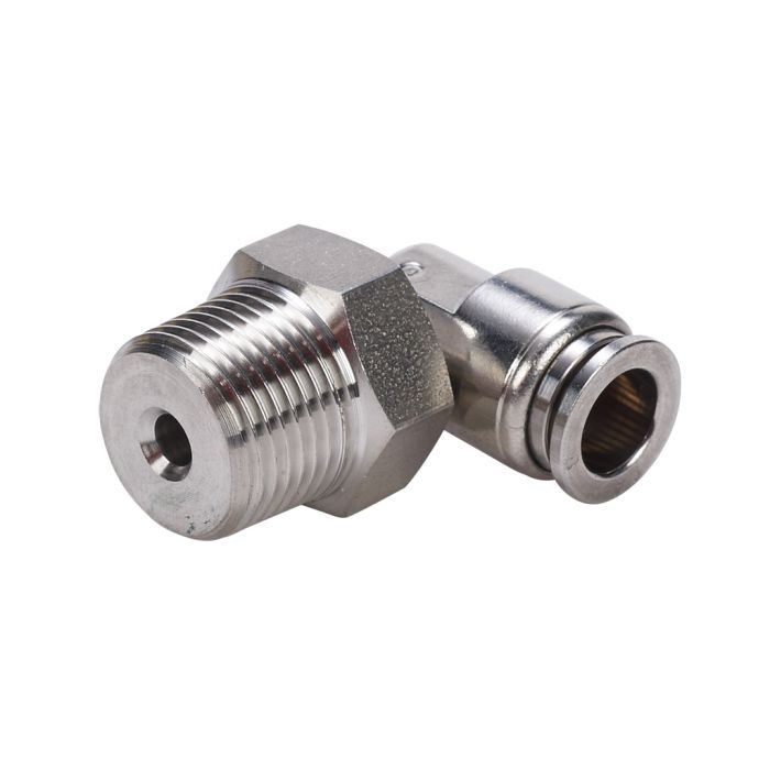 NITRA pneumatic push-to-connect fitting, male, elbow, rotating, 316 stainless steel body, 316 stainless steel threads, 5/16in (8mm) tube to R3/8 BSPT connection(s).