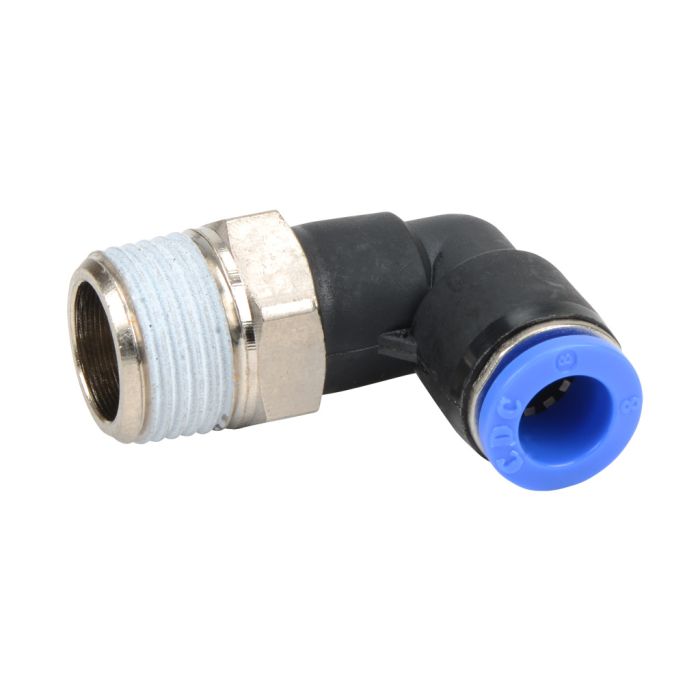NITRA pneumatic push-to-connect fitting, male, elbow, rotating, thermoplastic (PBT) body, nickel-plated brass threads, 5/16in (8mm) tube to R3/8 BSPT connection(s). Package of 5.