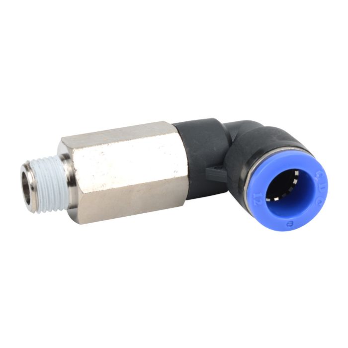 NITRA pneumatic push-to-connect fitting, male, long elbow, rotating, thermoplastic (PBT) body, nickel-plated brass threads, 12mm tube to R1/4 BSPT connection(s). Package of 5.