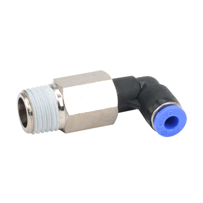 NITRA pneumatic push-to-connect fitting, male, long elbow, rotating, thermoplastic (PBT) body, nickel-plated brass threads, 5/32in (4mm) tube to R1/4 BSPT connection(s). Package of 5.