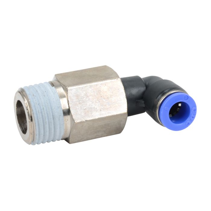 NITRA pneumatic push-to-connect fitting, male, long elbow, rotating, thermoplastic (PBT) body, nickel-plated brass threads, 5/16in (8mm) tube to R1/2 BSPT connection(s). Package of 5.