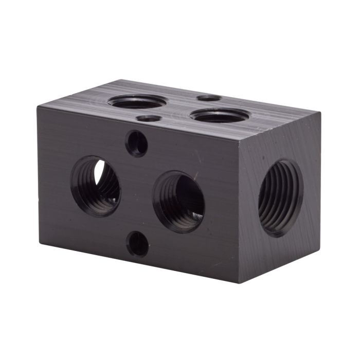 NITRA pneumatic valve manifold, aluminum, rectangular, 2 stations, (2) 3/8in female NPT inlet(s), (4) 1/4in female NPT outlet(s), standard hole spacing.