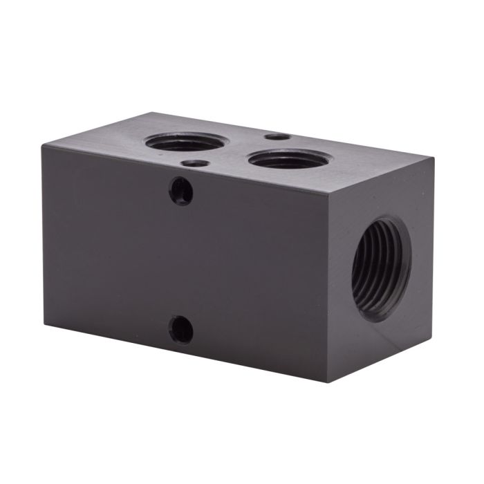 NITRA pneumatic valve manifold, aluminum, rectangular, 2 stations, (2) 1/2in female NPT inlet(s), (2) 3/8in female NPT outlet(s), standard hole spacing.