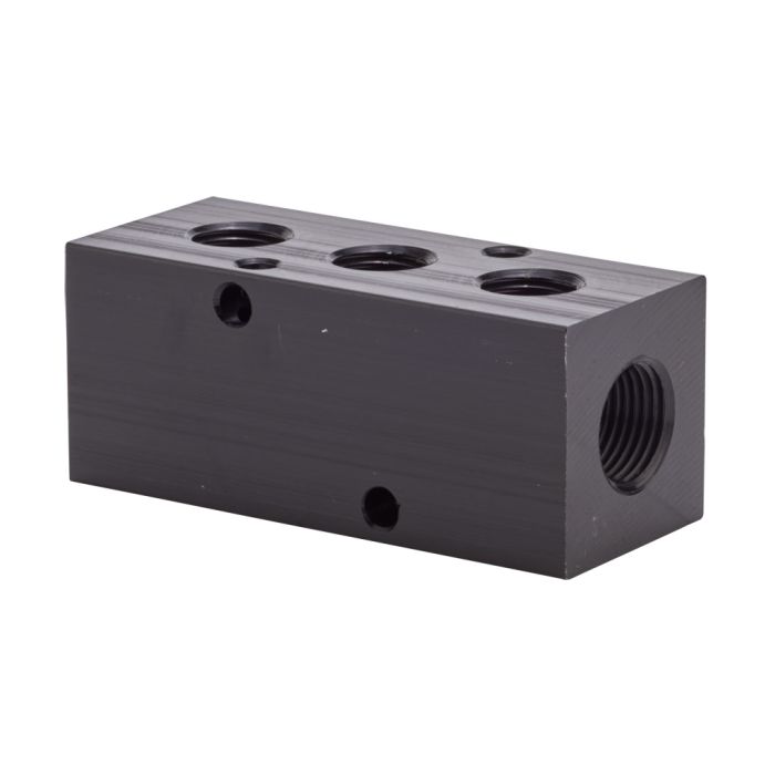 NITRA pneumatic valve manifold, aluminum, rectangular, 3 stations, (2) 3/8in female NPT inlet(s), (3) 1/4in female NPT outlet(s), standard hole spacing.