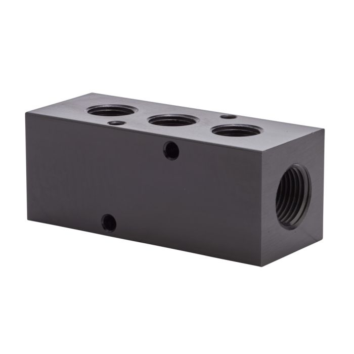 NITRA pneumatic valve manifold, aluminum, rectangular, 3 stations, (2) 1/2in female NPT inlet(s), (3) 3/8in female NPT outlet(s), standard hole spacing.