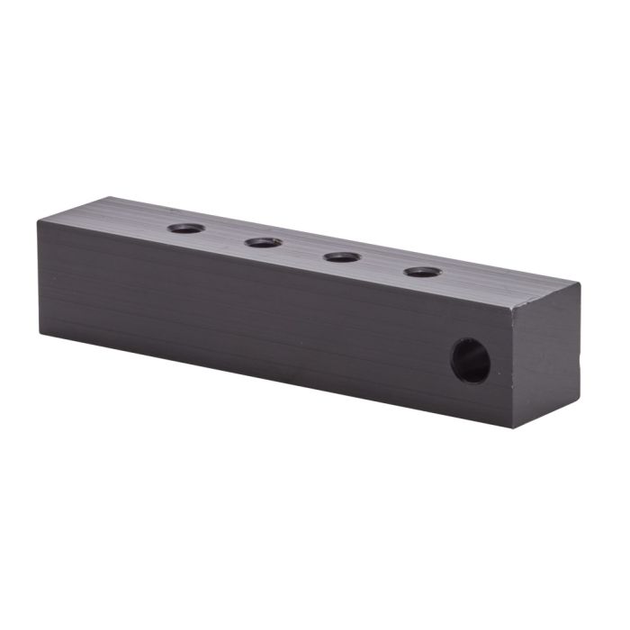 NITRA pneumatic valve manifold, aluminum, rectangular, 4 stations, (1) 1/8in female NPT inlet(s), (8) #10-32 female threaded outlet(s), standard hole spacing.