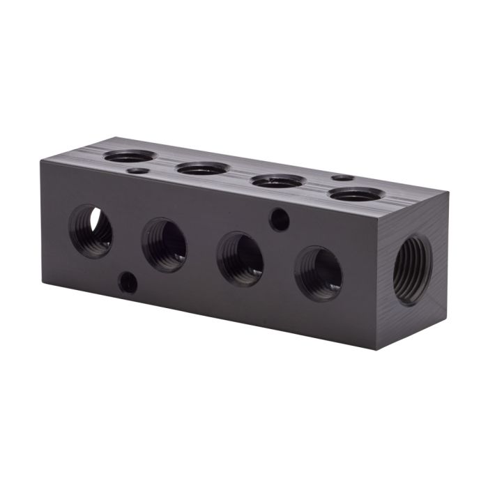 NITRA pneumatic valve manifold, aluminum, rectangular, 4 stations, (2) 3/8in female NPT inlet(s), (8) 1/4in female NPT outlet(s), standard hole spacing.