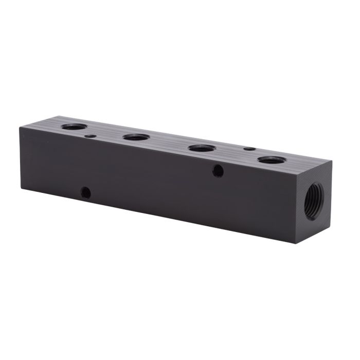 NITRA pneumatic valve manifold, aluminum, rectangular, 4 stations, (2) 3/8in female NPT inlet(s), (4) 1/4in female NPT outlet(s), wide hole spacing.