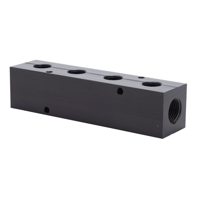 NITRA pneumatic valve manifold, aluminum, rectangular, 4 stations, (2) 1/2in female NPT inlet(s), (4) 3/8in female NPT outlet(s), wide hole spacing.