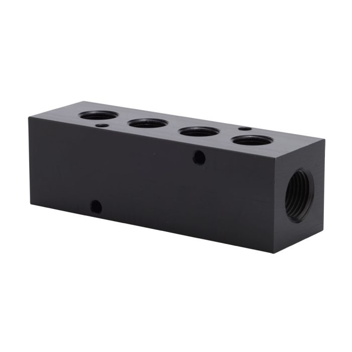 NITRA pneumatic valve manifold, aluminum, rectangular, 4 stations, (2) 1/2in female NPT inlet(s), (4) 3/8in female NPT outlet(s), standard hole spacing.