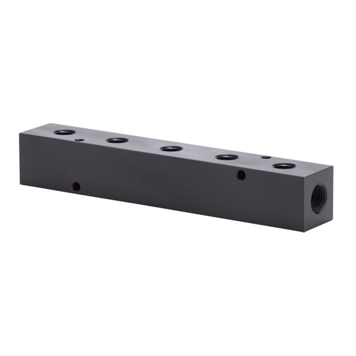NITRA pneumatic valve manifold, aluminum, rectangular, 5 stations, (2) 3/8in female NPT inlet(s), (5) 1/4in female NPT outlet(s), wide hole spacing.