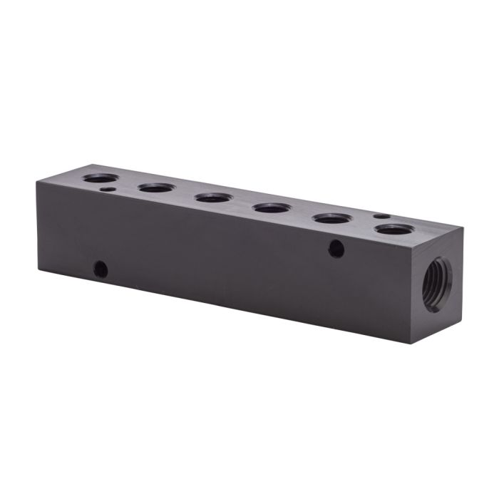 NITRA pneumatic valve manifold, aluminum, rectangular, 6 stations, (2) 1/4in female NPT inlet(s), (6) 1/8in female NPT outlet(s), standard hole spacing.