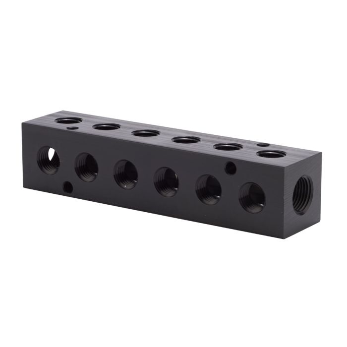 NITRA pneumatic valve manifold, aluminum, rectangular, 6 stations, (2) 3/8in female NPT inlet(s), (12) 1/4in female NPT outlet(s), standard hole spacing.
