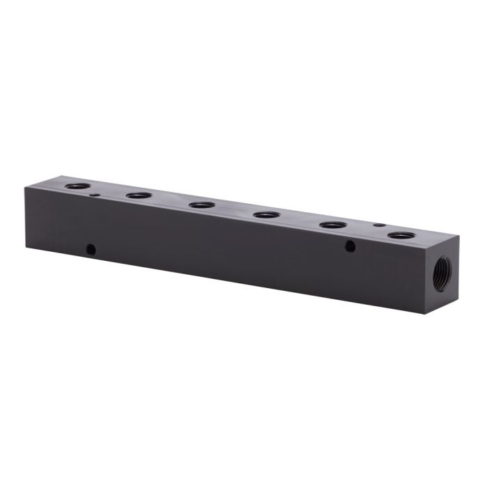 NITRA pneumatic valve manifold, aluminum, rectangular, 6 stations, (2) 3/8in female NPT inlet(s), (6) 1/4in female NPT outlet(s), wide hole spacing.