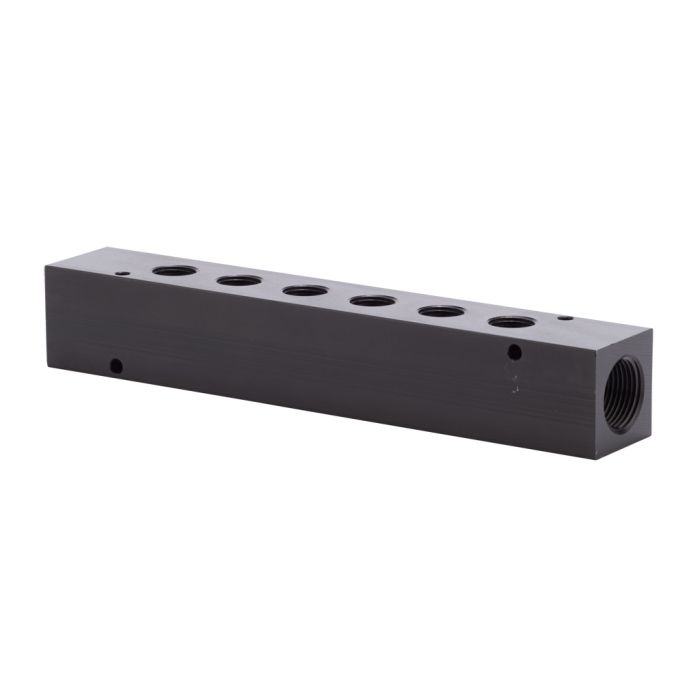NITRA pneumatic valve manifold, aluminum, rectangular, 6 stations, (2) 3/4in female NPT inlet(s), (6) 3/8in female NPT outlet(s), standard hole spacing.