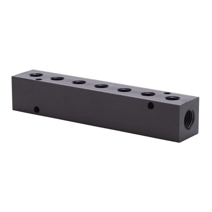 NITRA pneumatic valve manifold, aluminum, rectangular, 7 stations, (2) 1/4in female NPT inlet(s), (7) 1/8in female NPT outlet(s), standard hole spacing.