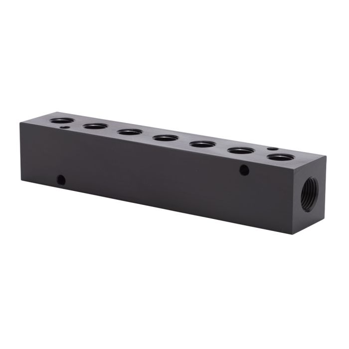 NITRA pneumatic valve manifold, aluminum, rectangular, 7 stations, (2) 3/8in female NPT inlet(s), (7) 1/4in female NPT outlet(s), standard hole spacing.