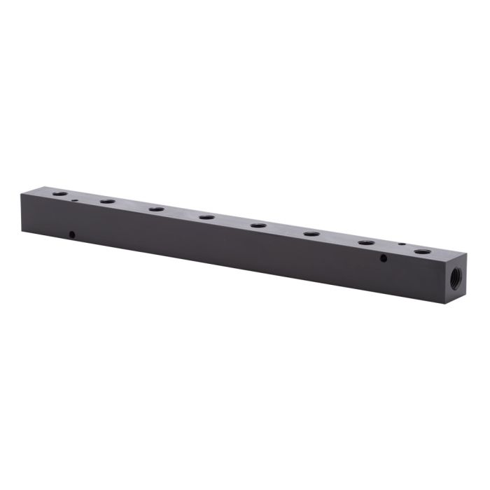 NITRA pneumatic valve manifold, aluminum, rectangular, 8 stations, (2) 1/4in female NPT inlet(s), (8) 1/8in female NPT outlet(s), wide hole spacing.