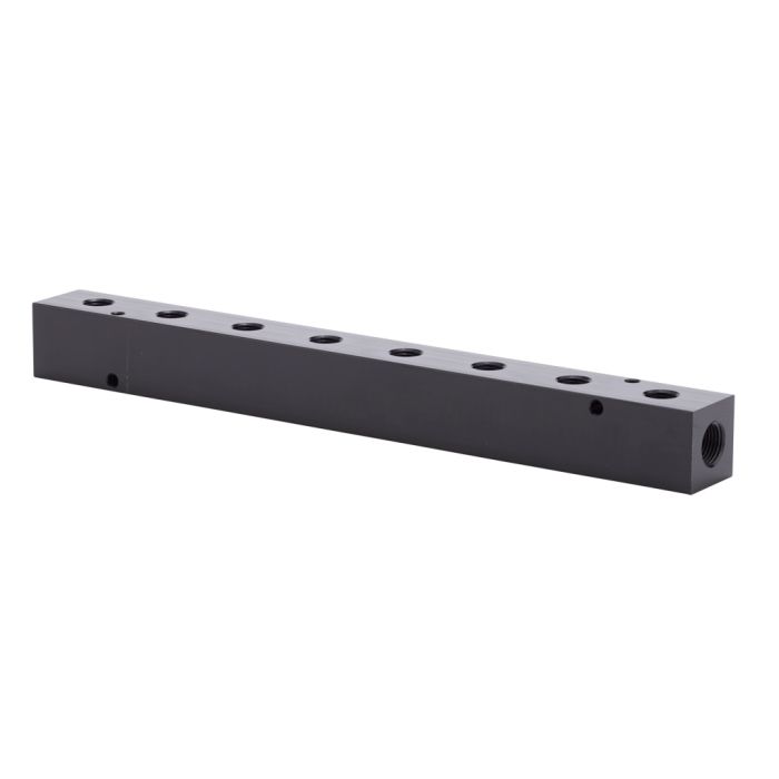 NITRA pneumatic valve manifold, aluminum, rectangular, 8 stations, (2) 3/8in female NPT inlet(s), (8) 1/4in female NPT outlet(s), wide hole spacing.