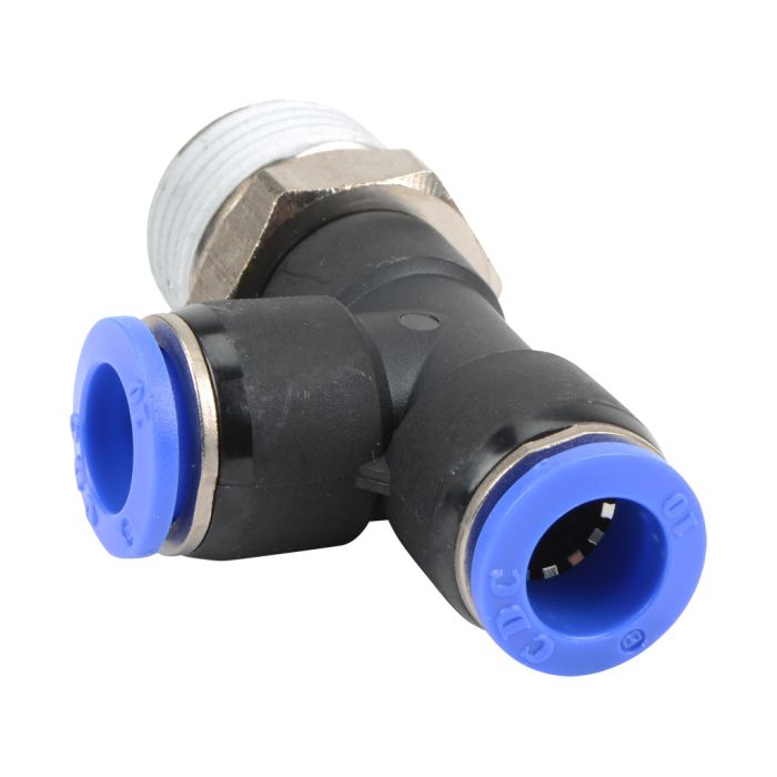NITRA pneumatic push-to-connect fitting, male, run tee, rotating, thermoplastic (PBT) body, nickel-plated brass threads, (2) 10mm tube to R1/2 BSPT connection(s). Package of 5.