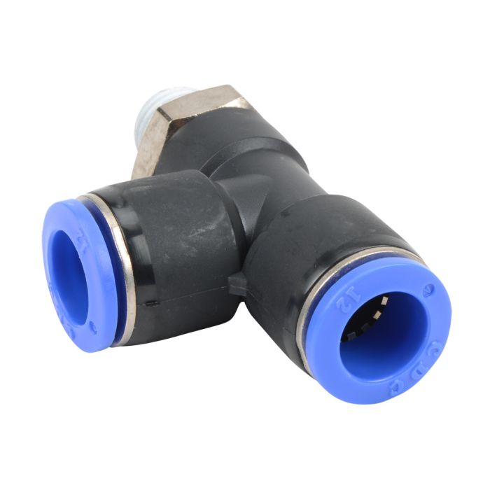 NITRA pneumatic push-to-connect fitting, male, run tee, rotating, thermoplastic (PBT) body, nickel-plated brass threads, (2) 12mm tube to R1/4 BSPT connection(s). Package of 5.