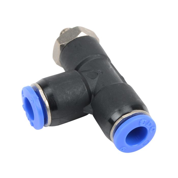 NITRA pneumatic push-to-connect fitting, male, run tee, rotating, thermoplastic (PBT) body, nickel-plated brass threads, (2) 6mm tube to M5 X 0.8 threaded connection(s). Package of 5.