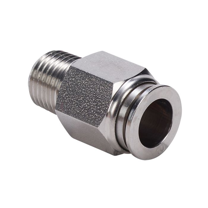 NITRA pneumatic push-to-connect fitting, male, straight, 316 stainless steel body, 316 stainless steel threads, 10mm tube to R1/4 BSPT connection(s).
