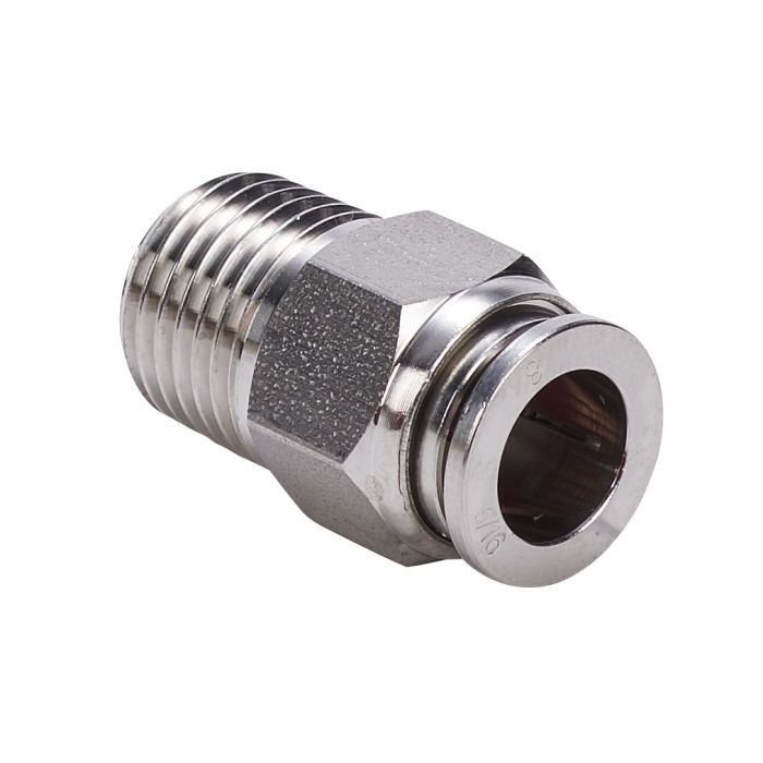 NITRA pneumatic push-to-connect fitting, male, straight, 316 stainless steel body, 316 stainless steel threads, 5/16in (8mm) tube to R1/4 BSPT connection(s).