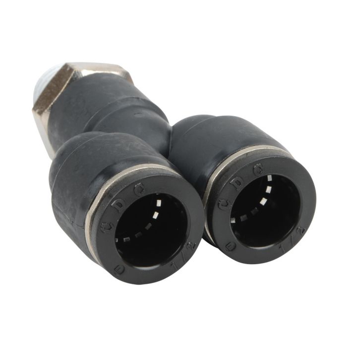 NITRA pneumatic push-to-connect fitting, male, Y, rotating, thermoplastic (PBT) body, nickel-plated brass threads, (2) 1/2in tube to 1/4in NPT connection(s). Package of 5.