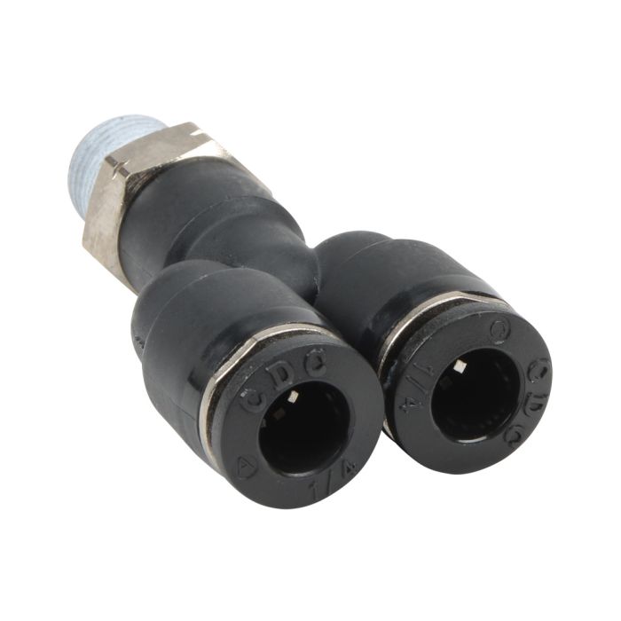 NITRA pneumatic push-to-connect fitting, male, Y, rotating, thermoplastic (PBT) body, nickel-plated brass threads, (2) 1/4in tube to 1/8in NPT connection(s). Package of 5.