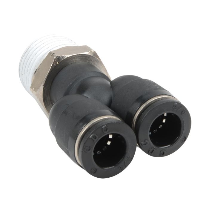 NITRA pneumatic push-to-connect fitting, male, Y, rotating, thermoplastic (PBT) body, nickel-plated brass threads, (2) 3/8in tube to 1/2in NPT connection(s). Package of 5.